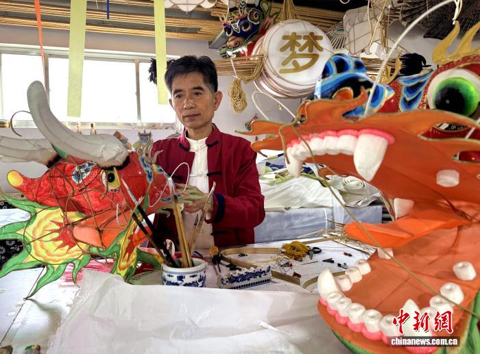 2月24日,山东潍坊,郭洪利在工作室赶制龙头蜈蚣风筝。郭嘉玮摄