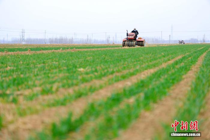 2月25日,山东聊城茌平,农民驾驶农机,对小麦进行春管作业。马红坤 摄