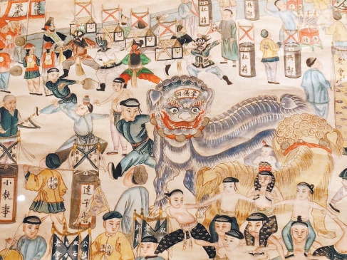 展览这次展出的清代《万寿山过会图轴》,图中描绘了京西万寿山过会的盛况。万寿山被绘制得层峦叠翠,图中可见北京西郊万寿山谐趣园观会楼前,宫中随侍官员与宫中女官静立墙旁,正在观赏墙外各类民间歌舞音乐的演出。近景场地上,盛大热闹的走会表演正在进行中,各路“走会”的队伍有:太狮老会、秧歌老会、神鼓老会、石锁老会、双石老会,还有官府组织的“兵部扛箱”“清道飞虎”等。其他节目还有儿童叠罗汉、踩高跷、演戏与武术等。这是一幅有时间、有层次、有故事的、色彩饱满鲜明的佳作。