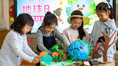 江西省九江市都昌县中心幼儿园,孩子们在制作环保手工作品。