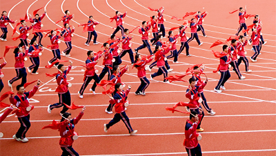 陕西省延安市延安中学学生在操场上开展安塞腰鼓活动。