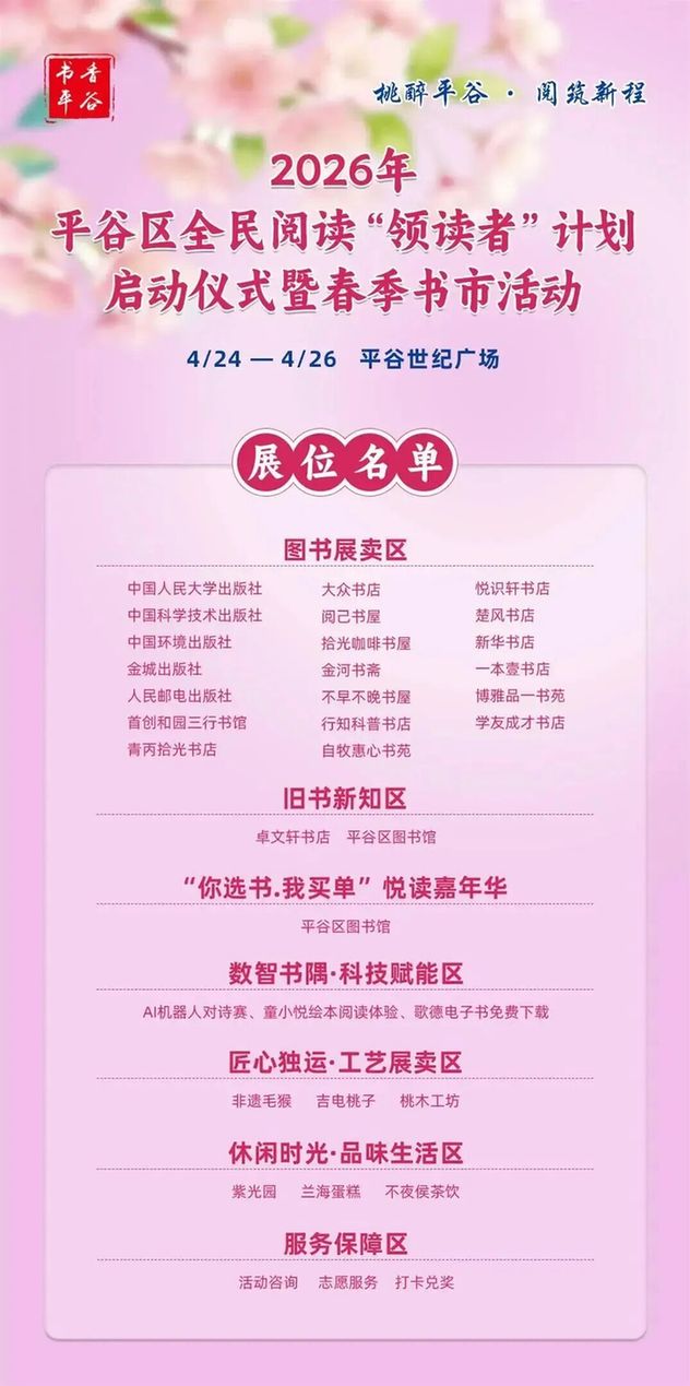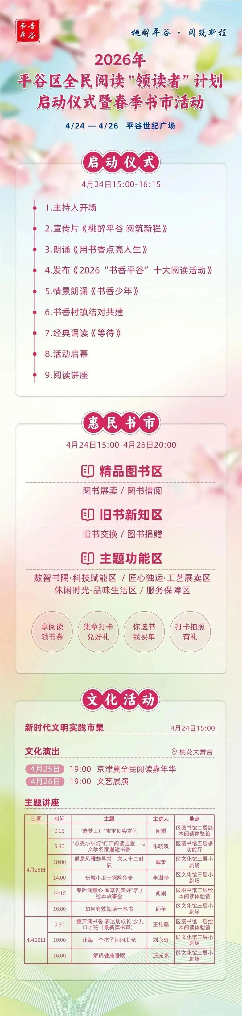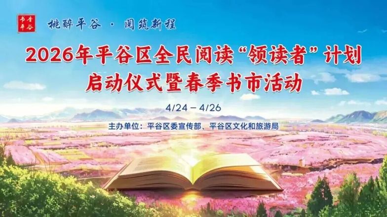 当全民阅读遇上桃花节,“桃醉平谷”不仅有花香还有书卷气。2026年平谷区全民阅读周活动将于4月24日下午在世纪广场重大开启!本届活动以“桃醉平谷阅启新程”为主题,由平谷区委宣传部、平谷区文化和旅游局主办,北京楚风文化公司承办,惠民书市、专家讲座、文明市集、文化演出四大类活动齐聚,阵容空前,折扣加购书券,优惠多多,让阅读更实惠、更有趣、更立体,为期三天的活动将持续到4月26日!