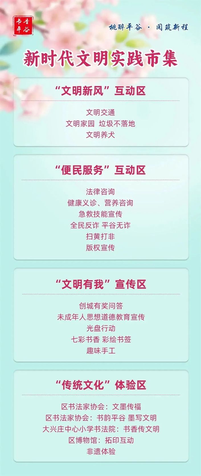 4月24日下午3点半,含政策宣传、文化体验在内的20个文明创城展位宣传同步开启,将惠民进行到底。4月24日-25日晚7点在桃花大舞台送上文化惠民演出,拉满现场气氛。