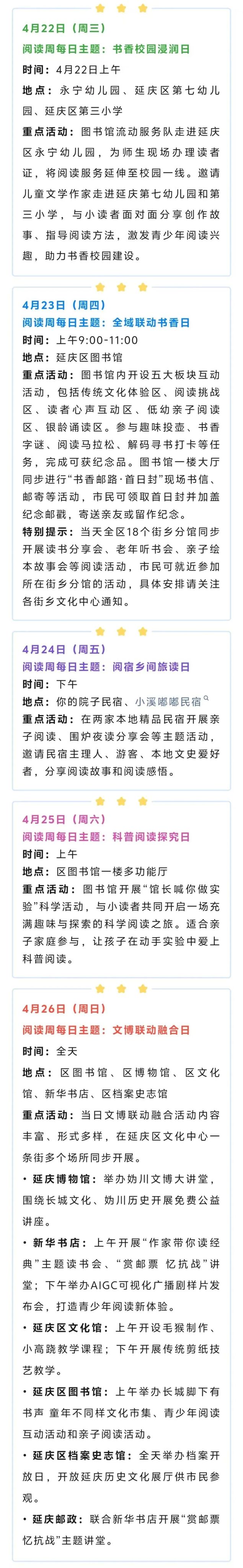 2026年4月20日,“长城脚下有书声 ‘阅’动最美冬奥城”2026年延庆区全民阅读周正式启动。此后一周,延庆将在“文博壹华里”馆城融合街区等地推出京冀携手共读日、全域联动书香日等各具特色的主题日活动,打造每日有亮点、全域有书香、全民可参与的沉浸式阅读盛宴,实现“馆馆有活动、处处有书声”,让书香浸润妫川烟火。