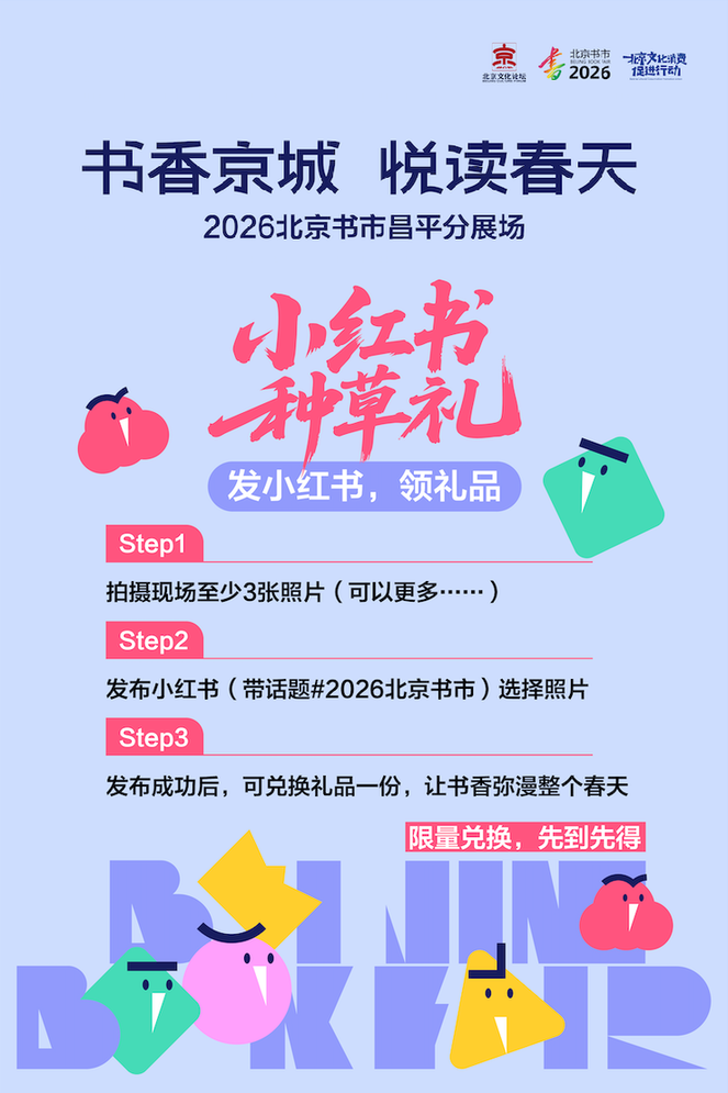 发小红书,带话题#2026北京书市,同时附带北京超极合生汇书市现场至少三张照片,发布成功后,可兑换惊喜礼品一份!